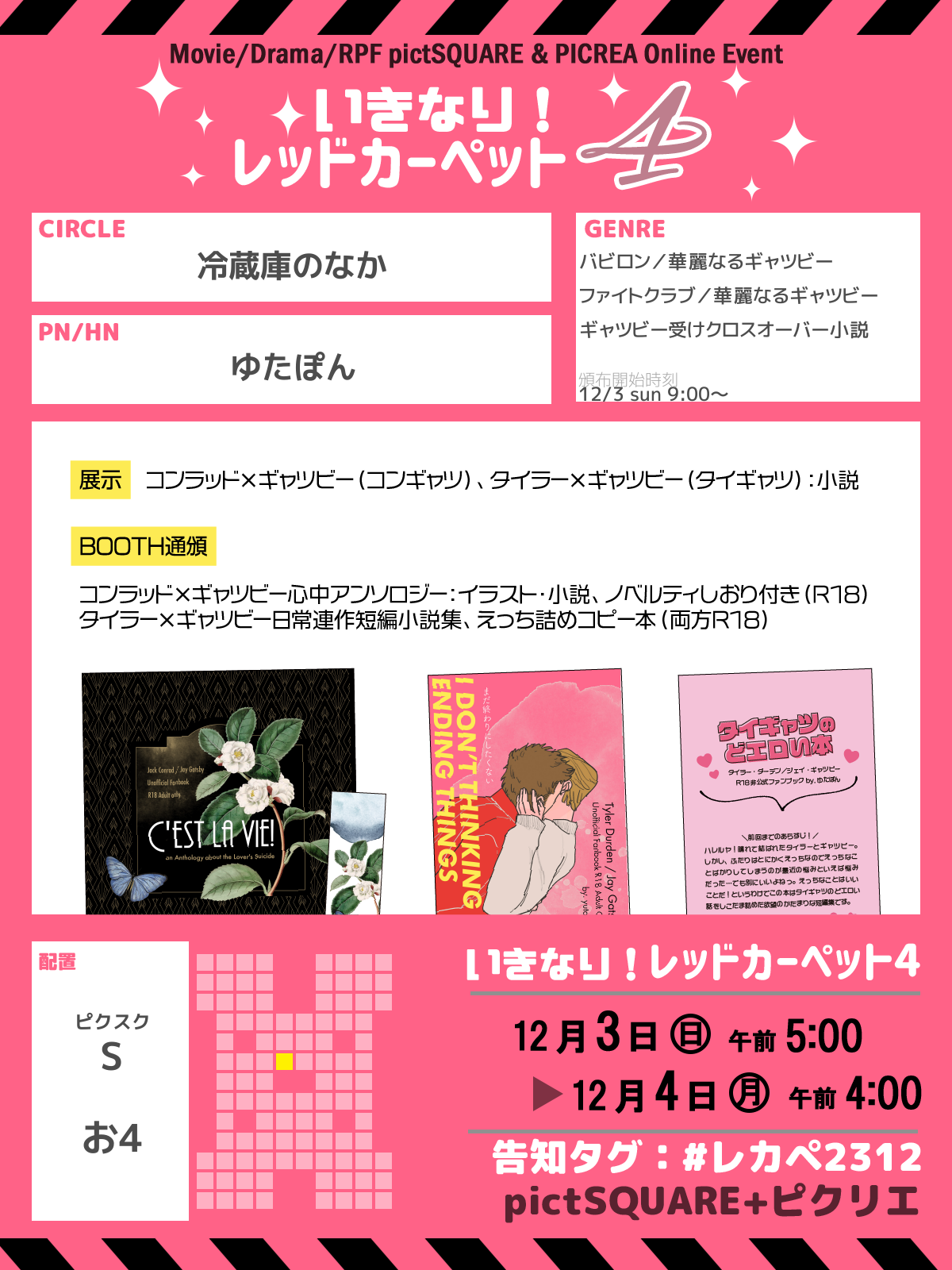 12/3(日)〜12/4(月)にかけて開催されるオンラインイベント「いきなり!レッドカーペット4」に参加します!にぎやかし程度ですが、むぱらで発行した同人誌の通頒と、コンギャツ・タイギャツの過去作小説を展示する予定です。